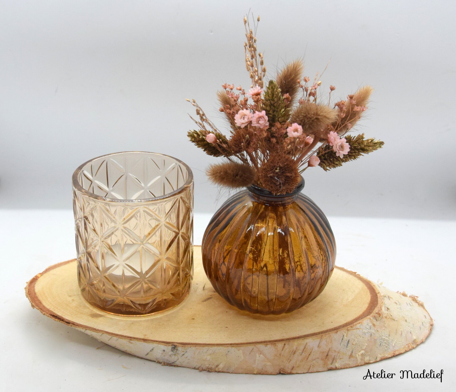 Vaasje op boomschijf met theelichtje