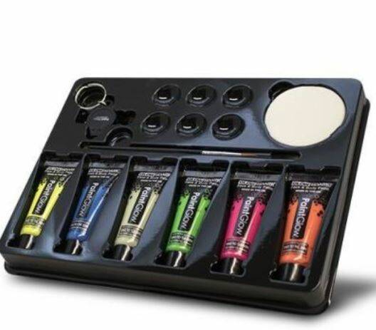 6x13ml colours, paintbrush, sponge, UV Light, mixing palettes, tutorial guide.